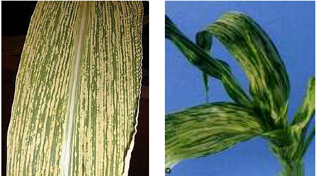 أهم أعراض الإصابة بهذا المرض هي ظهور خطوط صفراء باهتة أو بيضاء على أنصال الاوراق موازية لعروق النصل، وقد تكون هذه الخطوط قصيرة أو تتحد مع بعضها في خطوط طويلة وينتج عن اشتداد الاصابة قصر النبات وبالتالي نقص المحصول.