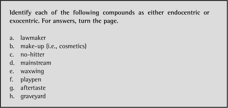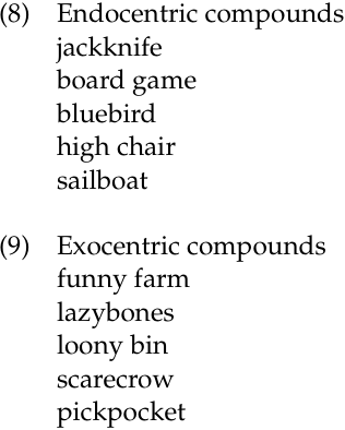 In discussing compounds, linguists sometimes use the terms endocentric and exocentric. These terms are related to the notions of motivation and compositionality presented earlier. An endocentric compound is one that has a head. The head expresses the core meaning of the compound, and it belongs to the same lexical category as the compound as a whole. For example, goldfish is an endocentric compound. It has a head, fish, which determines both the meaning and the lexical category – noun – of the compound as a whole. Compounds whose lexical category or meaning are not determinable from the head are exocentric. Figurehead is just such a compound, because it is not a type of head. Whether a compound is endocentric or exocentric is sometimes a matter of opinion. Fabb (1998: 67) gives the example of greenhouse, which is endocentric if you think of it as a type of house, but exocentric if you do not.