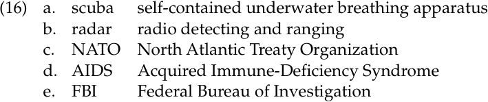 Acronyms are formed by taking the initial letters of a string of words and combining them to form a new one. In linguistics, speech is generally considered primary and writing secondary, and because acronym formation is dependent on orthography rather than pronunciation, many would consider it to be external to the general phenomenon of lexeme formation or at the very least a special case of lexeme formation that we would expect to find only among literate users of a language. If you question our statement that acronym formation is orthographically based, just say (16c) NATO aloud, followed by North Atlantic Treaty Organization. The pronunciation of the A and O reflects the name of the letters, not the initial sounds of the words.