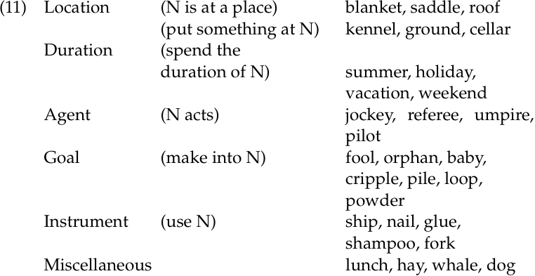 The descriptions given in (11) for each of the categories are slightly vague. One of the meanings given for the Location category is ‘put something at N’. To be more precise, verbs like kennel, ground (e.g., a teenager), or cellar involve keeping, not simply putting. Likewise, the true description of the Instrument category is much trickier than ‘use N’ because often you don’t use the noun – you use something else. For example, while shipping originally took place via ship, today we ship things by truck or air. We might redefine this category as ‘do what you do with N’. Even this, however, needs to be interpreted fairly broadly. Clark and Clark describe a fictional Max, who has a strange fetish – he likes to sneak up to people and stroke the backs of their legs with a teapot. When one of Max’s friends says to another, “Well, this time Max has gone too far. He tried to teapot a policeman,” we need to interpret teapot as ‘rub the back of the leg with a teapot’. By no stretch of the imagination is this what we think of as ‘doing what you do with a teapot’.