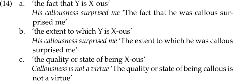 While other derivational formations don’t have as dramatic an array of potential meanings as zero-derived verbs, we still find variety. Aronoff (1976: 38) points out that new English nouns of the form X-ousness have three possible meanings, depending on context: