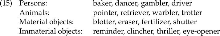 There are two possible analyses of agent nouns, both of which are reasonable. We won’t try to choose between them here. One is the strategy that we used above with zero-derived verbs, to assign the derivation a sparse semantic rule. We can follow Marchand in saying that an agent noun is ‘someone or something connected with what the base denotes’, or alternatively, ‘somebody or something whose function or characteristic is to perform a particular act’. For now we assume the latter. It permits the categories person, animal, material object, and immaterial object, as well as a habitual or non-habitual interpretation.