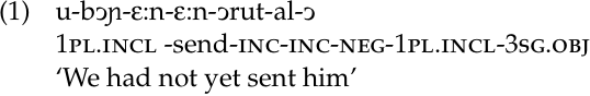 The core of (1) is a lexical root – bɔɲ ‘send’ – which provides the basic meaning of the verb. The rest of the meaning is conveyed by affixes on either side of the root. The first person plural inclusive subject is expressed by the circumfix u- … -al; the emphatic dubitive- incompletive by repetition of the dubitive-incompletive suffix - ε:n; the meaning ‘not yet’ by ɔrut; and the third person singular object by - ɔ. With the exception of the circumfixal subject marker, the relationship between meaning and form is one to one: the meaning of the word as a whole is the sum of its parts. Linguists refer to this type of morphology as agglutinative.