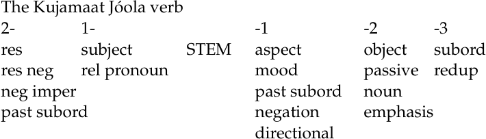 The order of morphemes in any language is typically fairly rigid, and Kujamaat Jóola is no exception. The following diagram schematizes the basic structure of the verb. At its core is the lexical stem, which may be simple or derived. The stem is followed by what Sapir refers to as position 1 suffixes, including aspectual, modal, and negative markers, as well as a derivational directional suffix and the second members of the past subordinate and first person plural inclusive circumfixes. Position 1 suffixes are followed by the position 2 suffixes: the passive marker, object pronominals (direct, indirect, or both), and noun emphasis marker. Finally, the third position is filled by verb reduplication and the simple subordinate marker. Immediately preceding the verb stem are the subject markers and relative pronouns (position 1 prefixes); the left-most position (position 2) is filled by the resultative, the resultative negative, the negative imperative, and the past subordinate markers. Many of these terms are probably new to you.