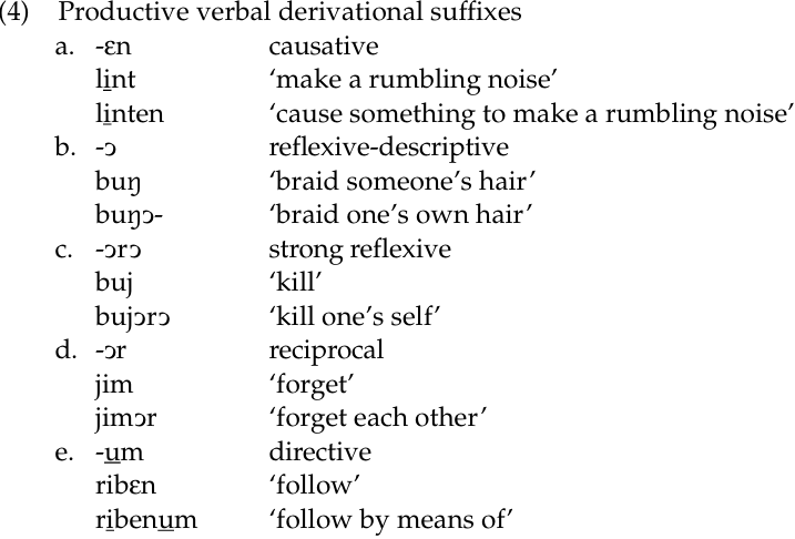 Inflectional affixes may attach to a root, or the root can be extended by the addition of derivational affixes. The root plus derivational affixes is called a stem. You have already encountered one verbal derivation suffix, -u ‘from’. Five more are listed below, with examples: