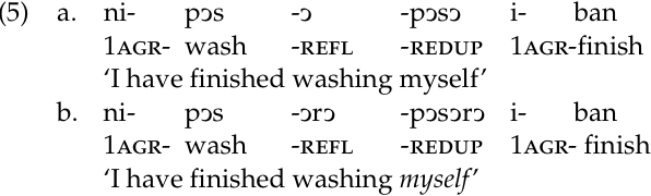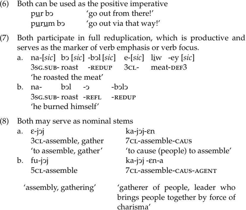 We see in (4c) that the root buj ‘kill’ can be suffixed with the strong reflexive to form bujɔrɔ ‘kill one’s self’. If a speaker were to add the reflexive-descriptive suffix (4b) instead, the result is a verb with more idiosyncratic semantics, bujɔ ‘be wounded’. The difference between affixation of the reflexive and strong reflexive is not always so striking, however, as we see in (5):