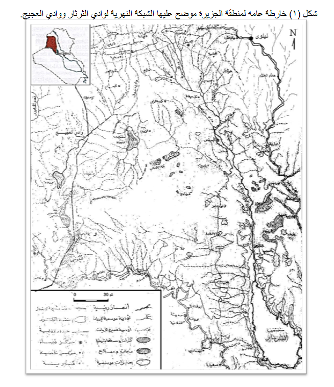 تركز الدراسه الحاليه على منطقة الجزيره والتي تقع في الطرف الشمالي الغربي للعراق والتي تمثل اقليم صحراوي – صخري متهضب قليلا. والاقليم محدد بمرتفعات سنجار- تلعفر-شيخ ابراهيم شمالا ونهر دجله شرقا ونهر الفرات جنوبا والحدود العراقيه السوريه غربا. الاقليم يشكل امتداد طبيعي لما يعرف ببادية الشام واللذي يمتد فوق الاراضي السوريه. تخترق ارض الجزيره شبكه من الوديان الجافه التي تنبع من المرتفعات الجبليه الشماليه ثم تنحدر تدريجيا وتتوحد في واديين رئيسيين تجري باتجاه الانحدار الجنوبي العام (شكل رقم 1).
