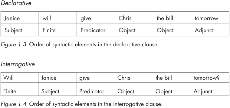 The clause is also the major grammatical unit used by speakers to ask questions, make statements and issue directives. Unless the conversation is very one-sided, the roles of ‘questioner’ and ‘informant’ tend to alternate between the interlocutors engaged in a conversation, as can be seen in the exchange of speech roles between Chris and Janice.