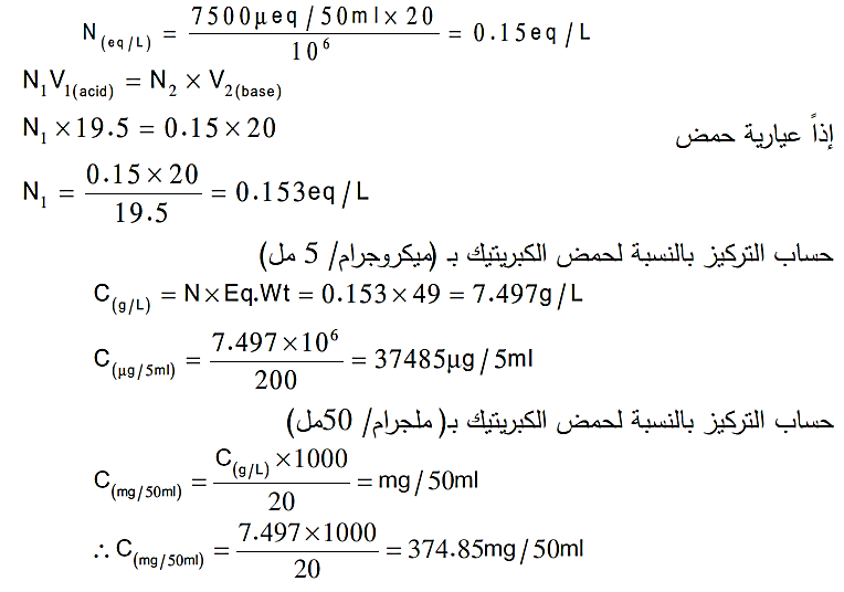 معایرة محلول حمض H2SO4 مجهول التركیز باستخدام محلول قیاسي من هیدروكسید البوتاسیوم تركیزه 7500) میكرومكافي/ 50 مل) .