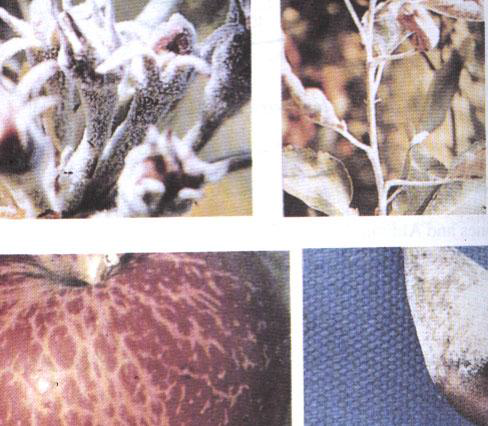 أعراض الإصابة بمرض البياض الدقيقي: على المجموع الخضري، على الأزهار، على ثمرة الكمثرى، على ثمر تفاح