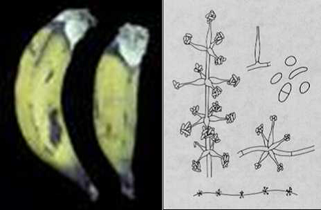 شكل يوضح مظاهر الاصابة بعفن طفية السيجار في الموز وشكل نمو وتفرع وجراثيم مسببه (الفطر فيرتيسليوم ثيوبرومي)