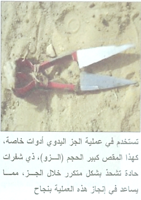 9. أدوات الجز: تستخدم حالياً أدوات الجز الآلية الكهربائية في عملية الجز، وسابقاً كانت تستخدم آلات بدائية مثل المقص الحديدي الزو، ويجب تجهيز آلة الجز قبل فترة من موعد الجز بحيث يتم فكها وتركيبها وتزيينها والتأكد من جاهزيتها، وكذلك تهيئة الكادر الفني الذي سيقوم بالعمل وإعلامه قبل فترة مناسبة من موعد الجز.