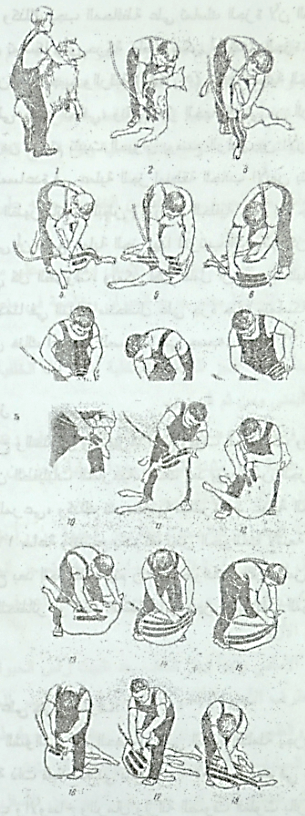 1. في البداية يتقدم العامل من الحيوان ويمسكه من الخلف ويجلسه على مؤخرته مستخدماً كلتا اليدين والقدمين.