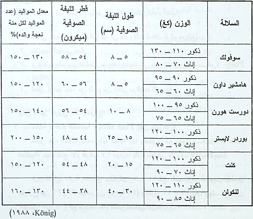 جدول يوضح بعض الصفات الانتاجية لاهم سلالات مجموعتي أغنام اللحم الانكليزية قصيرة وطويلة الصوف.
