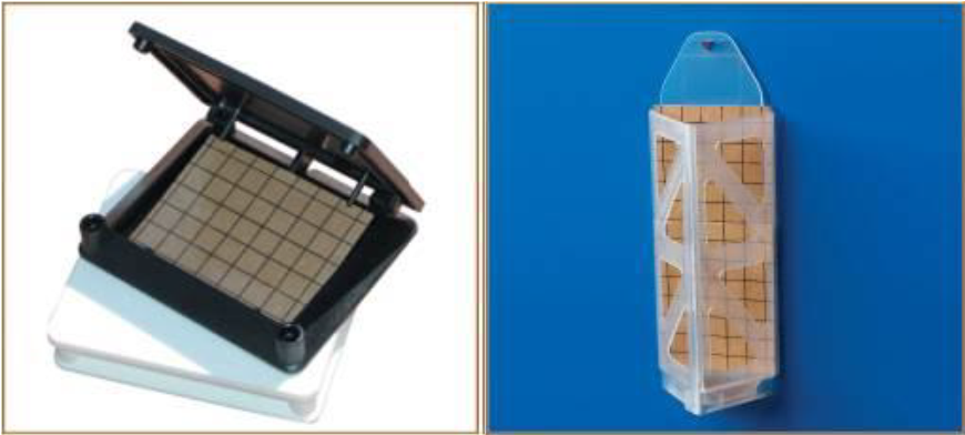 تصنع من ورق الكرتون المتعرج 2.5×9×9 سم، ويوضع حامل الفيرومون في احدى التجاويف المثلثة المفتوحة، كما يوضع في المصيدة أيضاً مادة زيتية لقتل الحشرات التي تنجذب اليها، ومن مميزات هذا النوع من المصائد صغر حجمها وقلة حجمها، وامكانية وضعها في شقوق الجدران او بين اكياس الحبوب، وتستعمل عادة لجذب خنفساء الخابرا وخنافس الدقيق.