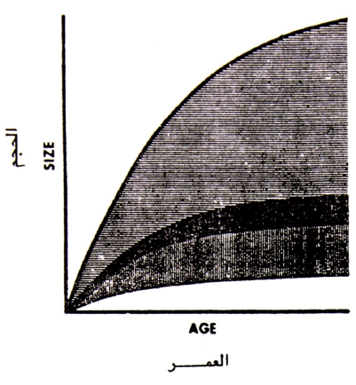 مقارنة معدلات النمو لأنواع سمك سريعة النمو (لأعلى) واخرى نموها بطئ (لأسفل) والمنطقة السوداء منطقة مشتركة لفقر نمو الانواع الاولى (سريعة النمو) وجودة نمو الانواع الاخيرة (بطيئة النمو)