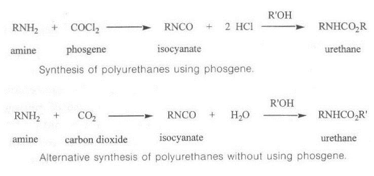 البولى يوريثانات Polyurethanes هى بوليمرلات واسعة الانتشار فى استخداماتها الصناعية . وترجع الخطورة فى تصنيع هذه البوليمرات أنها تحضر تقليديا باستخدام غاز الفوسجين . وهو غاز شديد الخطورة وتؤدى الإصابة الحادة به إلى الموت . وقد تمكنت مجموعة باحثين من شركة موناسنتو (1) من تحضير اليوريثانات ومركبات الايزوسيانات الوسيطة بطريقة تستبعد استخدام الفوسجين تماما .
