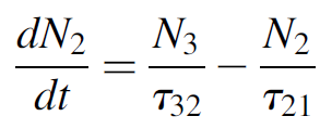 If radiation is present in the cavity, stimulated emission will occur at the rate of N2W21, and this will represent a loss. There will also be a process of absorption (really, a stimulated process opposite to stimulated emission, since it required a photon flux to be present) at a rate of N1W12 in the opposite direction as photons are absorbed and the energy is used to pump atoms in the LLL back to the ULL. Rate equations must now be rewritten to include these new terms, and it will be noted that as the photon flux increases, the amount of inversion (i.e., the difference in population between the two lasing levels) will decrease, as will gain of the laser!