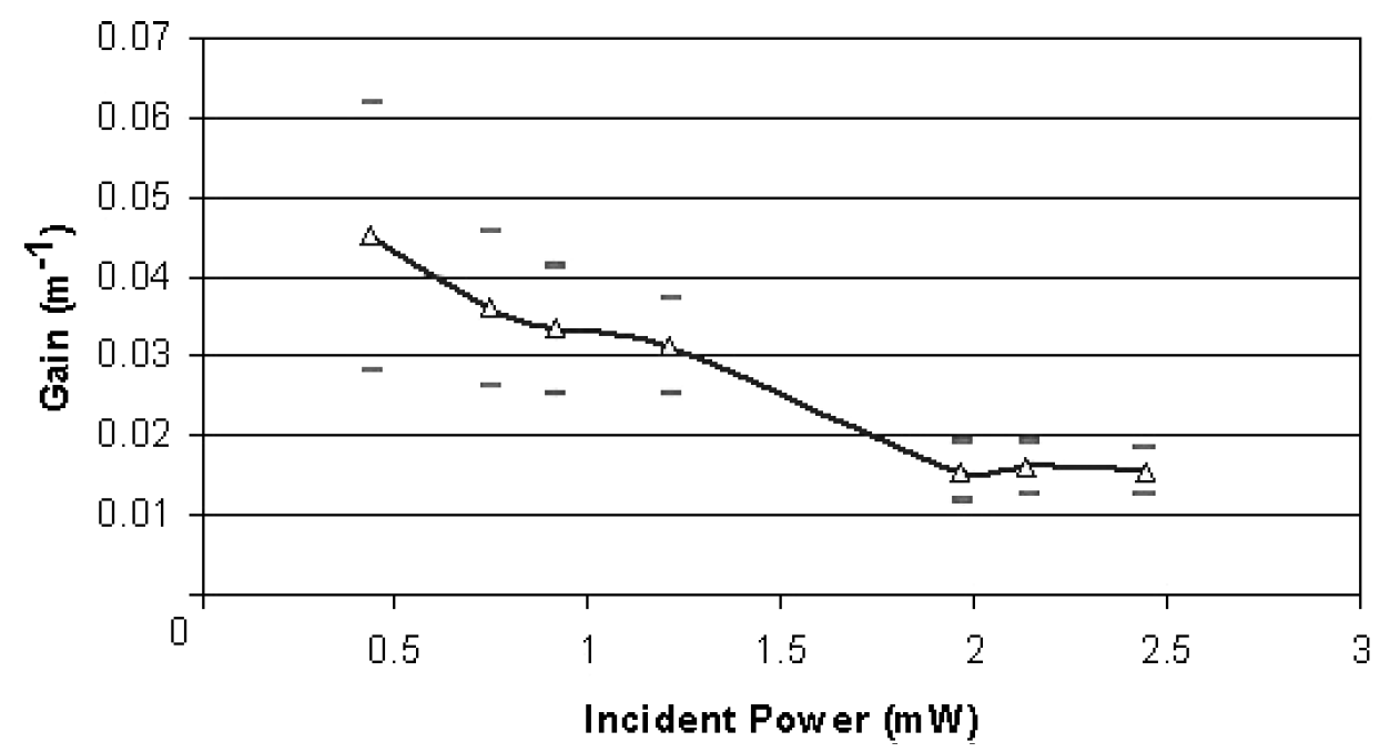The arrangement is one described, in which the beam from a laser (the probe beam) is passed through a second (amplifier) tube. Because of the oscillatory nature of the probe laser and limits on the resolution of the power meter employed, there is a large uncertainty in measurements taken at low power levels, as indicated by the error bars on the graph. Regardless, it can clearly be seen that gain is much higher at low intensities and drops as incident power increases. At about 1.6 mW of incident power the gain of the tube is measured to be only a half of what it was when the incident power was 0.4 mW. This is a smaller saturation intensity than expected; however, an estimate would not account for utilization of the lasing volume, a laser operating in the normal Gaussian mode (TEM00) does not use the lasing volume particularly efficiently.