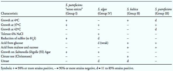Shewanella putrefaciens (synonym Pseudomonas putrefaciens). According to Bowman (2005) S. putrefacies was described for the first time in 1931, as Achromobacter putrefaciens. In 1941, it was transferred to the genus Pseudomonas, because of rod-shaped morphology, motility and strictly respiratory, non-fermentative metabolism. Based on the mol% G+C value, lower than that of the pseudomonads, the species was transferred in 1971 to the genus Alteromonas. Finally, based on the rRNA 5S sequence, in 1986 it was transferred to the new genus Shewanella. The nomenclature of this species continues in evolution, since it is composed by a variety of heterogenic strains, which includes at least four DNA hybridization groups. The strains of Group IV were transferred to the new species Shewanella algae (in1990) and the strains of Group II to the new species Shewanella baltica (in 1998). The strains of Group I are considered Shewanella putrefaciens “sensu stricto” and the new taxonomic position of the strains belonging to Group III has not yet been defined so far. The main characteristics of these four groups are described in Table 2.