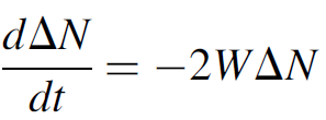 where τc is the lifetime of a photon in the cavity, ΔN is the population inversion at any given time t, and Wpump is the pumping probability. The left side of the equation (n/τc) represents the rate of photon loss in the cavity simply the number of photons divided by the lifetime of a photon and the right side of the equation represents the rate of photon gain simply the inversion times the pumping probability. We may now simplify the equation knowing that the pump rate can be expanded according to