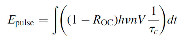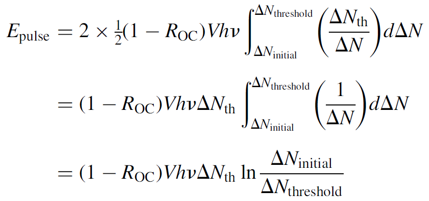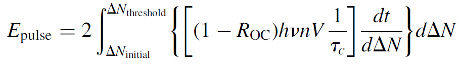 where the “2” in front corrects for the fact that the pulse is only half over when the threshold value is reached (assuming a symmetrical pulse). The term dt/dΔN can then be substituted for the inverse of equation (1.6) (also in terms of ΔN). Constant terms (such as ROC, hv, and threshold inversion ΔNth) are pulled out of the integral and several terms cancel, to yield a simple integral: