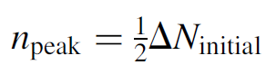 An exceedingly simple result! Bear in mind that assuming pulse termination at the threshold inversion and then multiplying by 2 is indeed a simplification of the problem, since real Q-switched pulses usually have a longer tail. The estimate provided here will yield an answer somewhat lower than the actual output, although results will vary according to the ratio of ΔNinitial /ΔNthreshold, but generally it is found to be within 20% of experimental results. Peak power is of particular interest for a Q-switched laser since this is the reason for using the technique in the first place. At peak power, the rate of change of the number of photons will be zero (i.e., at the top of the peak itself, where the curve is essentially horizontal). Setting dn/dt = 0 in equation (1.3), we find that the peak power occurs when ΔN = ΔNth [of course, we knew this already since we used it as a basis for the simplification in equation (1.13)]. By substituting this value into equation (1.10), we can obtain an exact expression for the number of coherent photons per unit volume at the peak of the pulse. Further simplification is possible if we assume that ΔNinitial is much, much larger than ΔNth (logical since this is required to produce giant pulses), so we can neglect many terms in the result to find that