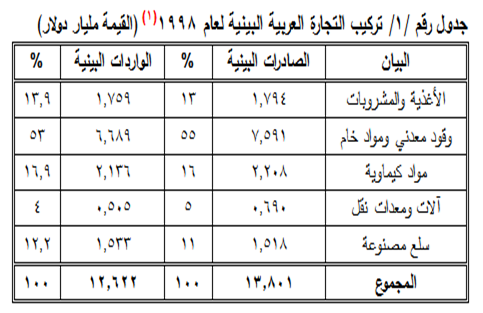 يعكس التركيب السلعي للتجارة العربية البينية في الصادرات والواردات حقيقة مهمة وهي تقارب النسب لجميع المـواد المشـاركة في التجارة العربية البينية في كل من الصادرات والواردات، وهذه بدورها تتطابق مع صورة الصادرات العربية للعالم الخارجي مع تفاوت بسيط في نسبة الصادرات والواردات من المواد الغذائية والمشروبات، حيث نلاحظ ارتفاع نصيب الوقود المعدني والمواد الخـام بحيث يسيطر هذا القطاع على الصـادرات والواردات العربية البينية معـاً لتشكل نسبته 55% من الصادرات العربية البينية و53% من الواردات، وتأتي في المرتبة الثانية المواد الكيماوية بنسبة 16% و16.9% في الصادرات والواردات على التوالي، ثم الأغذية والمشروبات 13% و13.9% على التوالي ثم المصنوعات 11% و12.2% على التوالي وأخيراً الآلات ومعدات النقل 5% و4% على التوالي.