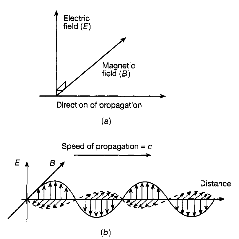 Figure 1.2: (a) Electric and magnetic fields in electromagnetic radiation; (b) an electromagnetic wave.