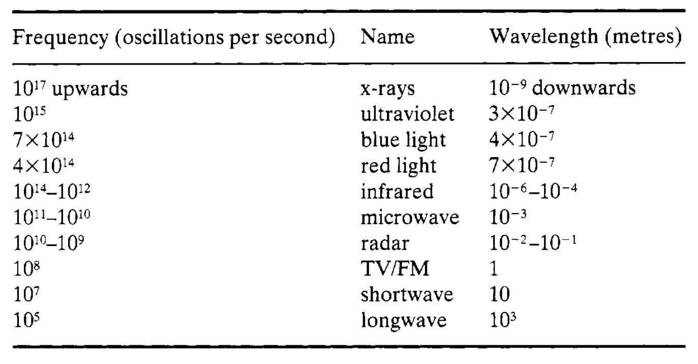 Table 1.1: Wavelengths and frequencies of different types of electromagnetic radiation.