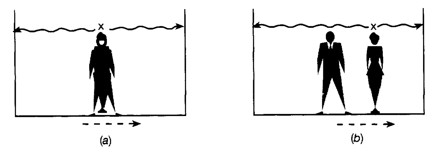 Two events are said to be simultaneous when they occur at exactly the same instant of time. This is straightforward to establish when both events take place at the same position in space, for example two trains arriving at the same time at a railway station. However, even in this example, the trains are not, fortunately, arriving at exactly the same position and to be sure that their arrivals coincided exactly the observer would need to station him/herself at the centre point between the two sets of buffers. If the trains touched the buffers at exactly the same instant the observer would see this to be so since, being exactly central, the light would take the same time to reach him/her from each set of buffers. The question then arises as to whether an observer in another inertial frame of reference would also agree that the trains had arrived together. To explore this let us leave trains and consider an idealized ‘thought experiment’. A thought experiment is a simple representation of a physical process unencumbered by unimportant peripheral details such as trains and buffers. Consider, in this instance, an observer standing at the centre of a room sending two simultaneous flashes of light to