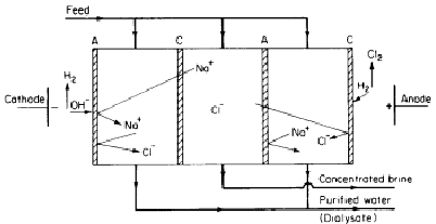 تستخدم الديأزة بالكهرباء (ED) أغشية للتبادل الأيوني في مجال كهربائي وتعتمد على واقع أنه ، عندما يمر تيار كهربائي مستمر عبر المياه الملحية في سلسلة من أغشية مبادل الكاتيونات ومبادل الأنيونات المتباعدة بدقة والمتوضعة على التناوب ، تمر الكاتيونات عبر أغشية مبادل الكاتيونات والأنيونات عبر أغشية مبادل الأنيونات ، مما يؤدي إلى خفض الملوحة في حيز واحد وزيادتها في الحيز التالي ، وهكذا عبر كامل الحزمة stack ( الصورة 1 - 1 ) . ويمكن التخلص من المياه ذات الملوحة الزائدة بتطريفها ، كما يمكن إعادة المياه ذات الملوحة المنخفضة للدوران عبر حزمة أو سلسلة من الحزم . لا تزيل هذه العمليات كل المعادن من المياه ، بل تختزل الملوحة في المياه الضاربة إلى الملوحة بحيث تجعلها قابلة للشرب ولاستخدامات عامة . قد تتراوح إزاله الأيونات من % 60 – 20 في الحزمة stack . هناك معالجة جديدة محسنة تعكس قطبية الإلكترودات دوريا وتتبادل تيارات الناتج والنفاية في وقت واحد. واستنادا إلى ما يقوله المصنعون فإن هذا النظام يمنع تشكل قشرة كربونات وكبريتات الكلسيوم .