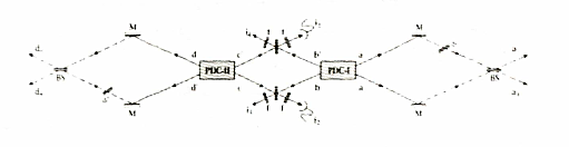 ومازال السؤال مطروحا : كيف يمكن إجراء تعالق لثلاثة فوتونات في المعمل؟ فهذا أمر لا يمكن تحقيقه إلا من خلال خاصية كمية محيرة حقا، كما تم توضيحه من خلال ما طرحه زايلنجر وشركاؤه العاملون معه عام ١٩٩٧ . وثمة توضيح في الشكل التالي.