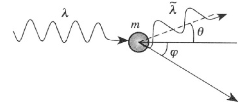 In the Compton effect, a γ-ray photon of wavelength λ strikes a free, but initially stationary, electron of mass m. The photon is scattered an angle θ, and its scattered wavelength is The electron recoils at an angle φ (see Figure 1.1).