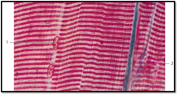 The characteristic striation is base d on the structure and arrangement of the myofibrils, which traverse the sarcoplasm lengthwise. This longitudinal section of the thyrohyoid muscle shows the parallel orientation of the myofibrils and the resulting fine longitudinal striation. There are alternating light and dark bands, with the dark bands being wider than the light ones. The dark cross-striations appear strongly birefringent in polarize d light (anisotropic, A -bands). The light bands are refrainment ( isotropic, I-bands). Inside the I-bands are very narrow anisotropic bands with a larger refractive index (Z-bands or intermediary layer). In suitable preparations, a very thin M-band (center membrane) is discernible inside the A-bands. The layers between consecutive Z-bands are called sarcomeres . These are the functional units of myofibrils. It should be noted that the nuclei are locate d at the cell periphery 1 . The (blue-stained) endomysium 2, which contains capillaries and nerve fibers, should also be noted.
