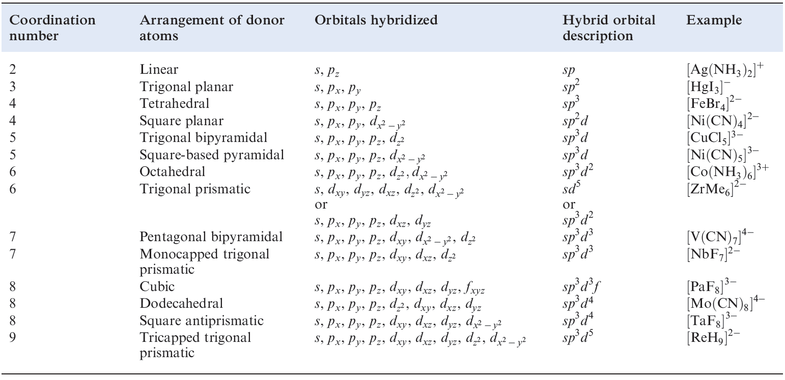 Table 1.1 Hybridization schemes for the σ-bonding frameworks of different geometrical configurations of ligand donor atoms.