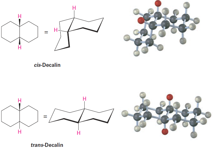 Decalin consists of two cyclohexane rings joined to share two carbon atoms (the bridgehead carbons, C1 and C6) and a common bond. Decalin can exist in either of two isomeric forms, depending on whether the rings are trans fused or cis fused. In cis-decalin, the hydrogen atoms at the bridgehead carbons are on the same face of the rings; in trans-decalin, the bridgehead hydrogens are on opposite faces. Figure 1-1 shows how both compounds can be represented using chair cyclohexane conformations. Note that cis- and transdecalin are not interconvertible by ring-flips or other rotations. They are cis– trans stereoisomers and have the same relationship to each other that cis- and trans-1,2-dimethylcyclohexane have.