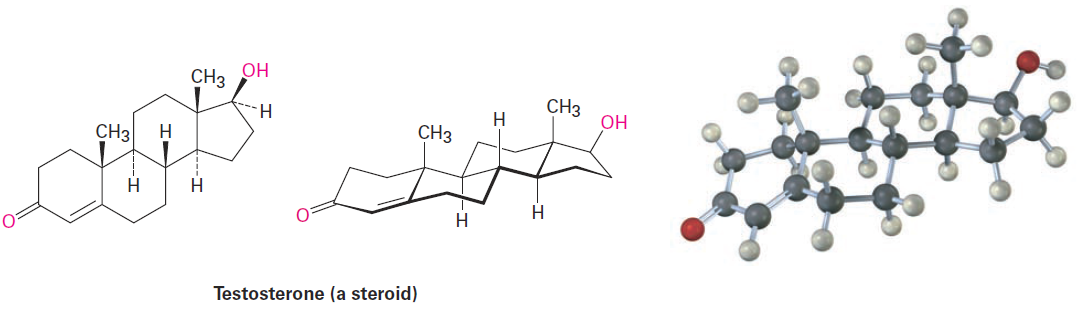 Polycyclic compounds are common in nature, and many valuable substances have fused-ring structures. For example, steroids, such as the male hormone testosterone, have 3 six-membered rings and 1 five-membered ring fused together. Although steroids look complicated compared with cyclohexane or decalin, the same principles that apply to the conformational analysis of simple cyclohexane rings apply equally well (and often better) to steroids.