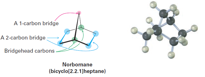 Another common ring system is the norbornane, or bicyclo[2.2.1]heptane, structure. Like decalin, norbornane is a bicycloalkane, so called because two rings would have to be broken open to generate an acyclic structure. Its systematic name, bicyclo[2.2.1]heptane, reflects the fact that the molecule has Compounds: Cycloalkanes and Their Stereochemistry seven carbons, is bicyclic, and has three “bridges” of 2, 2, and 1 carbon atoms connecting the two bridgehead carbons.