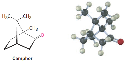 Note that, in drawing this structure, a break in the rear bond indicates that the vertical bond crosses in front of it. Making a molecular model is particularly helpful when trying to see the three-dimensionality of norbornane. Substituted norbornanes, such as camphor, are found widely in nature, and many have been important historically in developing organic structural theories.