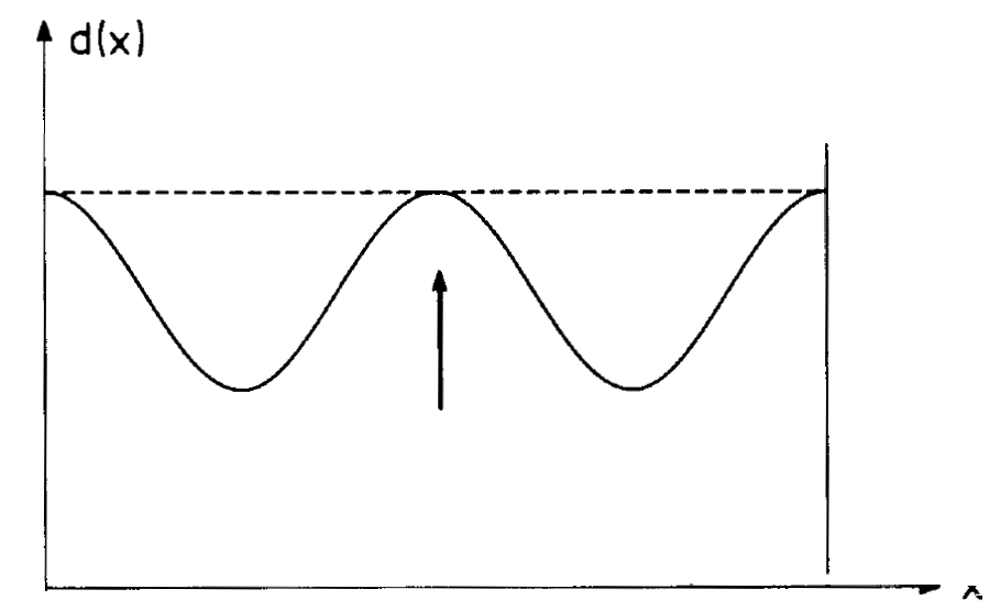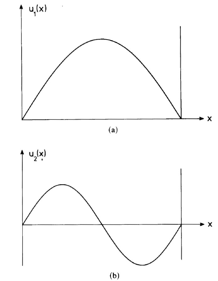 Fig. 1.1. In order to illustrate the possibility of coexistence of standing waves, in (a) and (b) the limiting cases of the two longest wave-lengths are shown. The mode amplitude is plotted versus the spatial coordinate x in axial direction.