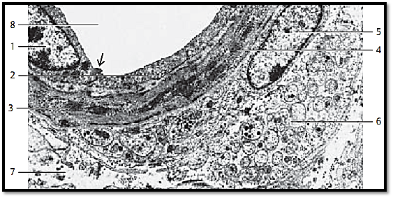 Arterioles are precapillary arteries (resistance vessels) with a diameter of less than 0.5 mm. This figure shows a section across the wall of an arteriole from the tunica adventitia of a human urethra. The endothelium is continuous 2 . Smooth circular muscles form the underlying tunica media 3 . Bundles of unmyelinated axons 6 are located in the tunica externa. Contact between two neighboring endothelial cells .