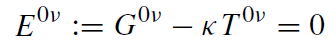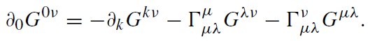 Since Gμν contains no higher derivatives of gμν than the second, the right hand side of this equation also contains only second x0 derivatives. Hence (1.5) implies that the four components G0ν only involve first x0-derivatives. Now choose x0 the as time coordinate. The four (0, ν)-components of (1.3) then do not involve second time derivatives, unlike the space–space components (i, j). Hence the time-time and time–space components are constraints, that is, equations that constrain the allowed choices of initial data, rather than evolving them.