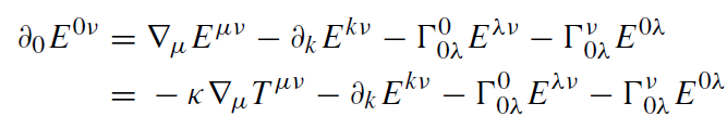 by using (1.13) in the last step. Now consider again the evolution of initial data from a surface of constant x0. If they initially satisfy the constraints and are evolved via Ei j = 0 (hence all spatial derivatives of Eμν vanish initially) they continue to satisfy the constraints if and only if the energy momentum tensor of the matter satisfies