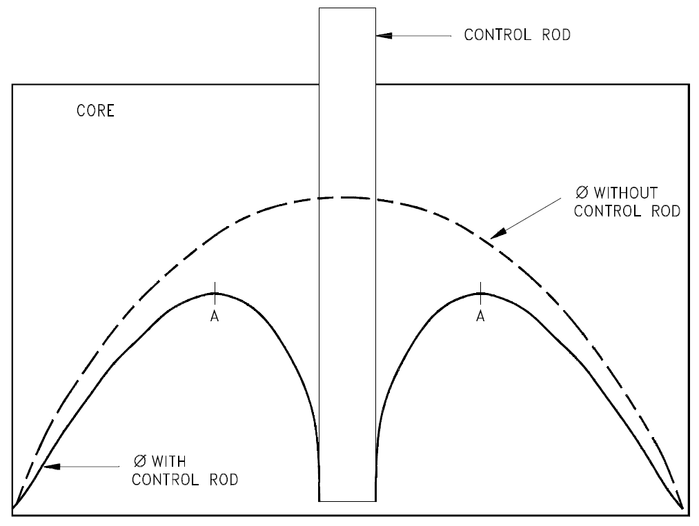 The effectiveness of a control rod depends largely upon the value of the ratio of the neutron flux at the location of the rod to the average neutron flux in the reactor. The control rod has maximum effect (inserts the most negative reactivity) if it is placed in the reactor where the flux is maximum. If a reactor has only one control rod, the rod should be placed in the center of the reactor core. The effect of such a rod on the flux is illustrated in Figure 1.