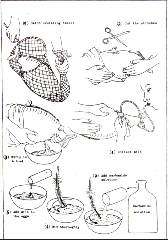 وقبل التنبيه الهرموني قد تخاط الفتحة التناسلية الأنثوية لمنع نزول البيض. وبعد التنبيه الهرموني للإناث والذكور تخدر الإناث (بعد صيدها بشبكة مفتوحة الطرفين أو ملقف) بوضع قطنة مبللة بالمخدر 222-MS في الفم، ثم تدلك البطن في إناء، سواء والأنثى موضوعة على منضدة أو ممسكة باليد وذلك بعد فك غرز الخياطة في الفتحة التناسلية. كما يسحب السائل المنوي من الفتحة التناسلية للذكر (بخرطوم رفيع يصل إلى زجاجة مسدودة ويخرج منها الطرف الآخر للخرطوم لسحبه بالفم) أو بالتدليك لإنزاله على نفس آنية جمع البيض. ثم يقلب بريشة ويضاف إليه محلول كارباميد ويقلب 3–5 دقائق ويضاف مزيد من محلول الإخصاب (كارباميد) ويقلب باليد، ثم يغير محلول الكارباميد عدة مرات ثم يوضع البيض في محلول تانين (لترسيب البروتين لإزالة أغلفة البيض ). ويقلب باليد 3–5 ثوان ، ويغسل 3–4 مرات بالماء وينقل إلى الحضان الذى تختلف درجة حرارته (٨-3٠ م) ومدة التحضين فيه (14 ساعة الى 12 يوما) وتختلف اليوم –درجة فيه (من 16-110) حسب نوع السمك. وبعد التخضين اللازم يفقس البيض فتخرج اليرقات. وقد يغسل البيض المخصب في معلق طمى لإزالة المادة اللاصقة كما في بيض الحفش.