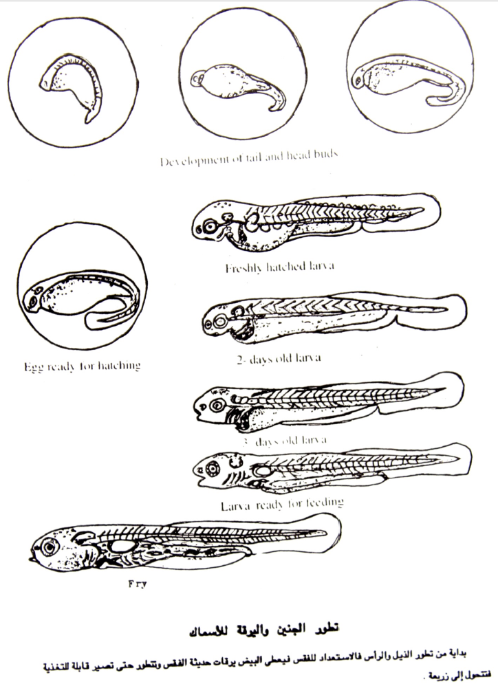 وعقب وضع البيض في الحضانات يخفض معدل تدفق الماء بما لا يزيد عن ۱-۲ لتر / دقيقة ويزداد تدريجيا. ويتم التحضين على ٢٠-٢٤ م فيفقس البيض في ظرف 4-5 ايام للمبروك. و عند الفقس يكون في آواني مبطنة بقماش ناعم كالبارلون ليسمح برقاد البيض في اول الفقس حتى يمتص كيس الصفار في مدة 2-4 ايام من الفقس – والفرق بين اليرقات والزريعة هو ان الاولى تتغذى ذاتيا على بقايا كيس المح ولا تسبح بطريقة السمك بل راسيا، وتتحول اليرقة الى زريعة عندما تبدا في ملء مثانتها بالهواء وتعوم افقيا بطريقة السمك وتأكل الاحواض او النامية في احواض خاصة وتنقل لتغذية الزريعة في احواض رعايتها، او يتم تغذيتها صناعيا على صغار البيض المسلوق او بيض الجمبري (ارتيميا) والقشريات الدقيقة كأفضل اغذية لزريعة الاسماك.