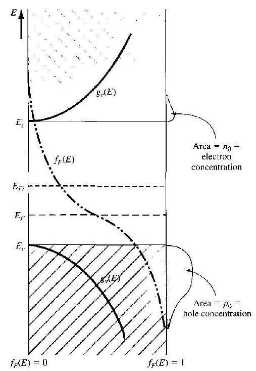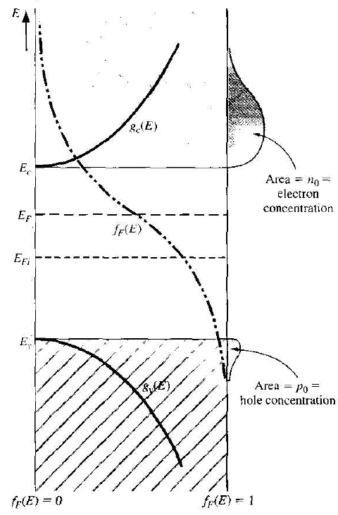 Figure 1.2 Density of states functions, Fermi-Dirac probability function, and areas representing electron and hole concentrations for the case when EF is below the intrinsic Fermi energy.