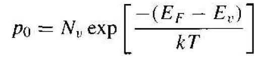 The expressions previously derived for the thermal-equilibrium concentration of electrons and holes, for n0 and p0 in terms of the Fermi energy. These equations are again given as