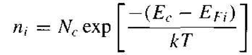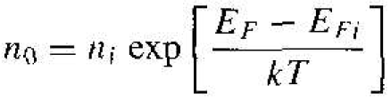 Adding donor or acceptor impurity atoms to a semiconductor will change the distribution of electrons and holes in the material. Since the Fermi energy is related to the distribution function, the Fermi energy will change as dopant atoms are added. If the Fermi energy changes from near the midgap value, the density of electrons in the conduction band and the density of holes in the valence hand will change. These effects are shown in Figures 1.1 and 1.2. Figure 1.1 shows the case for EF > EFi and Figure 1.2 shows the case for EF < EFi. When EF > EFi, the electron concentration is larger than the hole concentration, and when EF < EFi, the hole concentration